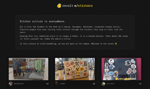revolt with stickers opened its eyes to the world today, built with Framer. In this release, you can join the revolt by using the “upload your art” button and adding your own creation.